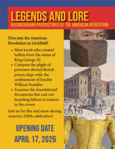 Legends and Lore: Reconsidering Perspectives of the American Revolution examines Litchfield’s well-known tales: the melting of a statue of King George III on South Street; the imprisonment of William Franklin in Litchfield; the escape of local loyalists to Canada; those who enlisted to fight and those who supported from home. The accounts of these events have been saved, told, and retold countless times, but do these accounts truly record the revolution or give us a nostalgic picture of these events? Legends and Lore pairs archival records with current research to grapple with what the revolution represented to those who lived it and ask visitors what the fight for freedom means today.